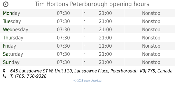 It is also possible to : Edit these OPENING HOURS of Restaurant Tim Hortons In Peterborough, 645 Lansdowne ST W, Unit 110, Lansdowne Place,